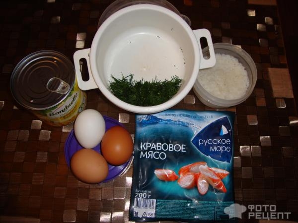 Приступим. Вот такие продукты понадобятся нам для приготовления. 200 граммов отварного риса. Несколько веточек укропа, которые я мелко порезала. Банка консервированной кукурузы. 200 граммов крабового мяса. И три куриных яйца, сваренных вкрутую.