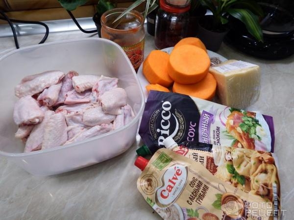 Рецепт: Куриные крылышки на морковной подушке — в майонезном маринаде под сырной корочкой