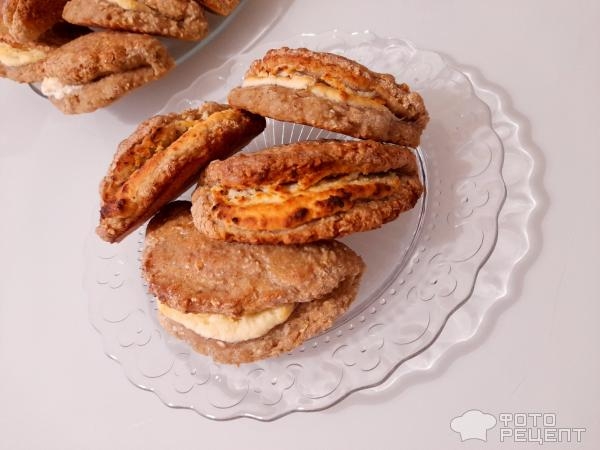 Противень смазываем тонким слоем сливочного масла. Влажными руками формируем овальные лепешки толщиной около одного сантиметра. Выкладываем начинку на половину лепешки и накрываем.