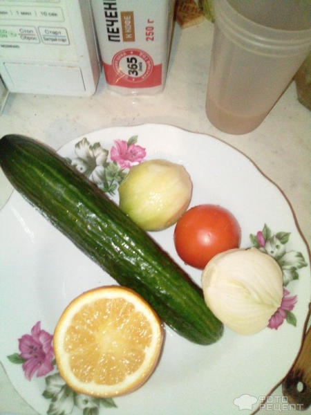 Этот салат превосходно дополнит ваш семейный ужин. Помидор огурец и лимон помыть. Редьку и лук очистить от кожуры. Лук режим полукольцами и замачиваем в холодной воде, редьку режим на четыре части и нарезаем тонкими ломтиками и отправляем также как и лук в холодную воду, что бы ушла лишняя горечь, острота .