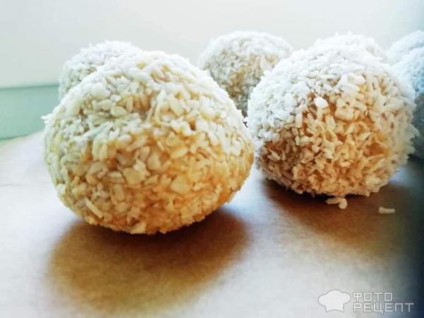 Подготовленные шарики обваливаю в кокосовой стружке и ставлю в холодильник примерно на 1 час.