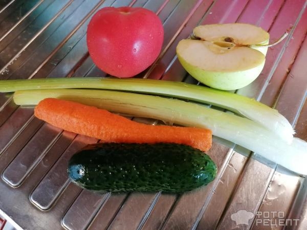 Есть вообще не хочется, а вот пить очень даже! Поэтому предлагаю приготовить овощной смузи. Ингредиенты используем как для овощного салата, у меня это помидор, огурец, пара стеблей сельдерея, морковка и половинка яблока.