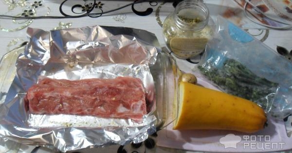 Рецепт: Свиные ребрышки с овощами запеченные в фольге — в фольге, с кабачком, лучком и брокколи