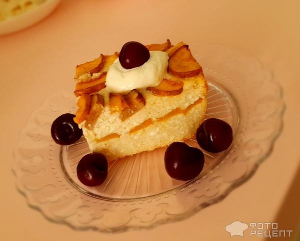 Готовую запеканку нужно охладить и можно нарезать на порции. Подаем творожно-фруктовую запеканку со сметаной и спелой черешней.