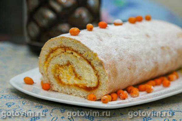 Рулет из кокосового бисквита с творожной начинкой и облепиховым желе