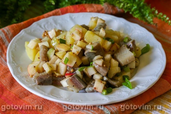Полить получившимся соусом салат, посыпать свежей рубленой зеленью, перемешать и можно подавать к столу. Салат из сельди с яблоком и картофелем готов. Приятного аппетита!