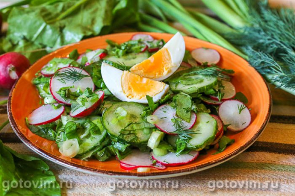 Салат из щавеля с огурцом, яйцом, редисом и горчичной заправкой