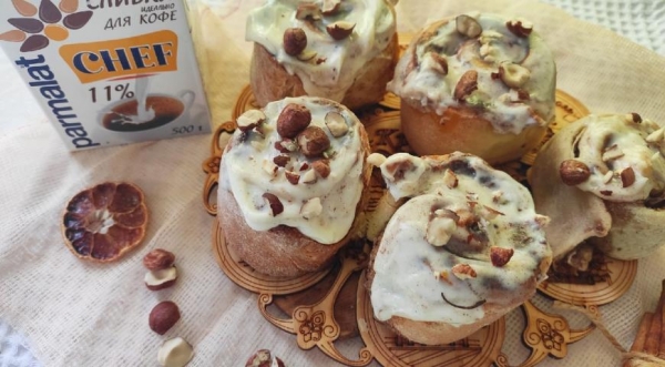 Пока пекутся булочки, смешиваем все вместе ингредиенты для крема и взбиваем миксером до состояния помадки. На горячие булочки обильно наносим кисточкой крем и сверху посыпаем молотыми орехами. Приятного аппетита!