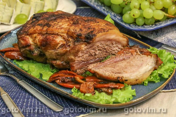 Через 2 часа приоткрыть фольгу, полить мясо соусом, снова закрыть фольгой и готовить еще не менее 1 часа, время от времени поливая соусом со дна формы. Готовность свинины проверяют шпажкой или лучиной — она должна легко проходить насквозь куска мяса. Переложить готовое мясо на тарелку, а соус из формы процедить и проварить, пока он не загустеет и не станет блестящей глазурью. Полить ею мясо и подавать на стол. Томленная свинина готова. Приятного аппетита!