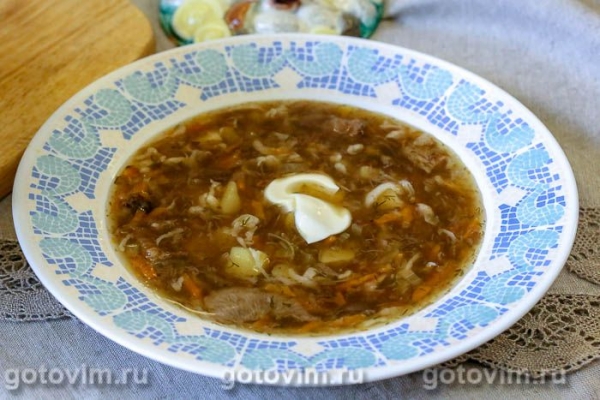 Пора пускать в дело лесные заготовки – замороженные в бульоне грибы. Суп получился ароматным, густым, с заметными кусочками лесных грибов и вкусными вкраплениями вареного теста — «подбойки». Добавка из жидкого теста меняет вкус грибного супа, добавляя ему что-то от домашней лапши. Да и смотрится грибная похлебка наряднее и аппетитнее.