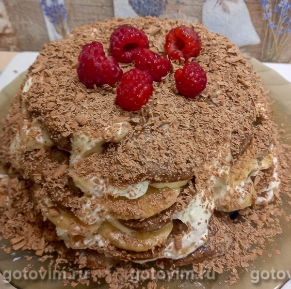 Торт без выпечки готовят всего из трех ингредиентов. Он получается мягкий, просто тающий во рту. Для торта лучше всего подойдут шоколадные пряники, а бананы легко заменить на консервированные ананасы или персики. Между слоями можно добавить молотые грецкие орехи или тертый шоколад.
