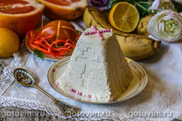 Готовая творожная пасха заметно уплотниться и её легко будет перевернуть на блюдо. Аккуратно снять марлю с творога и украсить по своему вкусу. Творожная пасха с заварным банановым кремом готова. Светлой пасхи!