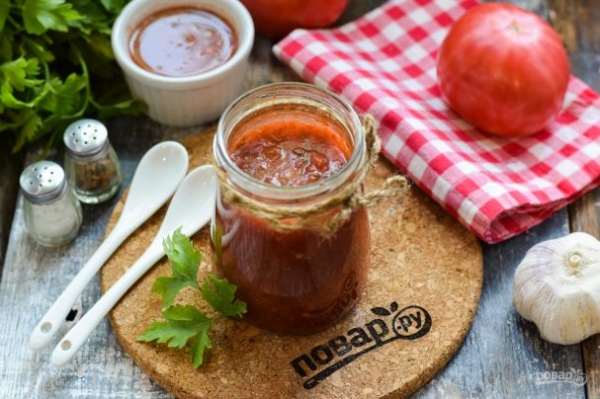 За основу берем сочные и спелые помидоры, чеснок, перец, специи. Остроту добавим чили. Уверена вам понравится такой вариант томатного соуса с грузинскими нотками.