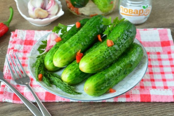 Приготовьте быстрые малосольные огурцы с перцем чили. Закуска получится острой и пикантной. Огурцы будут хрустящими и пряными.