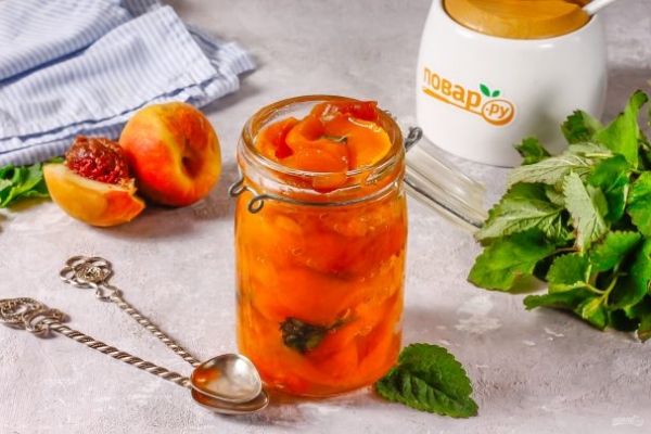 Ароматное варенье из персиков получится еще вкуснее, если вы приготовите его с добавлением свежей мяты. Лакомство можно заготовить и на зиму, оставляя себе немного на пробу к чаю со свежей выпечкой.