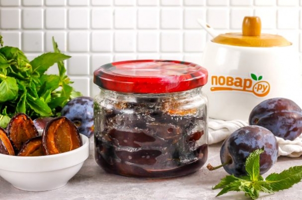 Ошпарьте банку кипятком или прогрейте ее и крышку в духовке вместе со сливами. Выложите горячие сливы в банку.