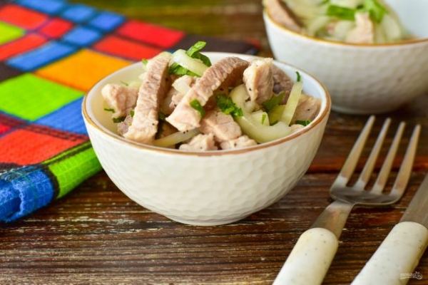 Мясо для приготовления салата лучше отварить заранее, чтобы потом на эту процедуру не тратить много времени. Вместо репчатого лука подойдет и фиолетовый. Растительное масло можно заменить оливковым. Обычный 9% уксус — яблочным.