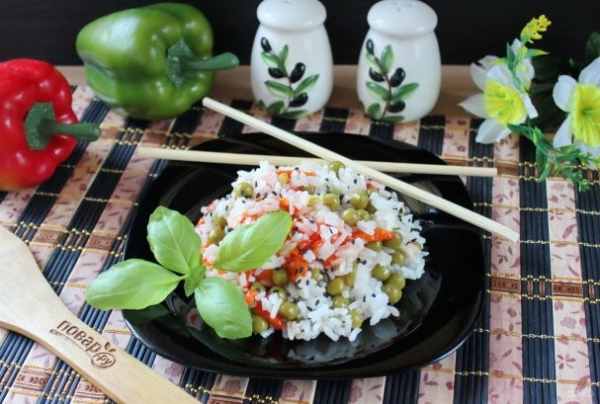 После нарежьте и выложите в салатник с рисом и зеленым горошком.
