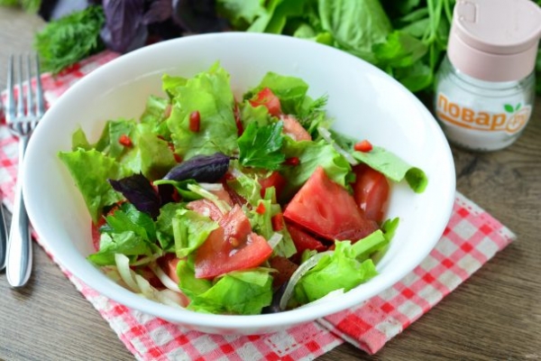 Острый салат с помидорами и перцем чили будет прекрасным дополнением к любому гарниру. Перец чили добавляйте в салат по вкусу. Кто любит остренькое, кладите побольше. Также в салат добавьте побольше свежей зелени — это вкусно и полезно. Я добавила все, что было в холодильнике: листья салата, немного петрушки, укропа и базилика. Для заправки идеально подходит оливковое масло холодного отжима.