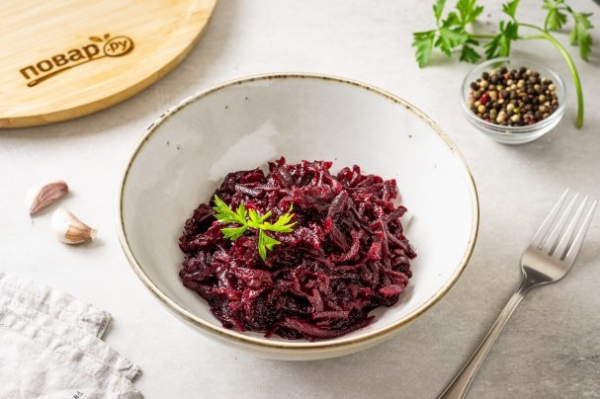 Заправьте свеклу, перемешайте. Оставьте салат на 1 час промариноваться в холодильнике.