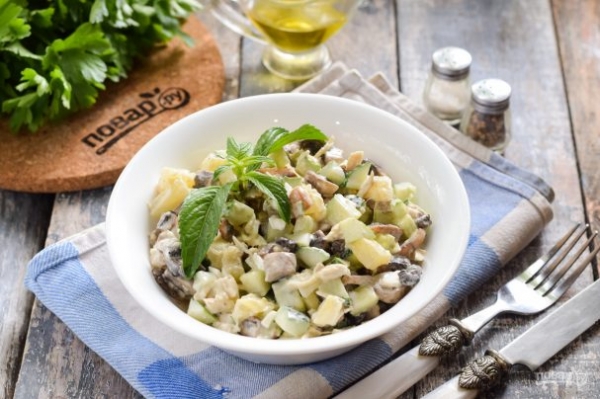 Куриную грудку для салата можно как отварить, так и запечь. Мне нравится результат в обеих вариантах. Добавим свежий огурец и шампиньоны, для заправки используем майонез. Подавать салат можно смело на праздничный стол. Я уверена, сочетание вкуса понравится многим, поэтому, готовьте салат с удовольствием!