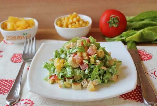 В этом рецепте все ингредиенты хорошо сочетаются и дополняют друг друга. Консервированный ананас и кукуруза придают сладость, помидор легкую кислинку, пекинская капуста свежесть. А сухарики добавляют сытость и делают блюдо хрустящим.