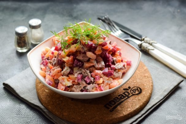 Овощи для этого салата необходимо заранее отварить или запечь, также накануне отварить говядину. Для заправки используем майонез. Благодаря вареным овощам и мясу салат получается довольно сытным. Берите рецепт на заметку и готовьте с удовольствием для родных и близких.