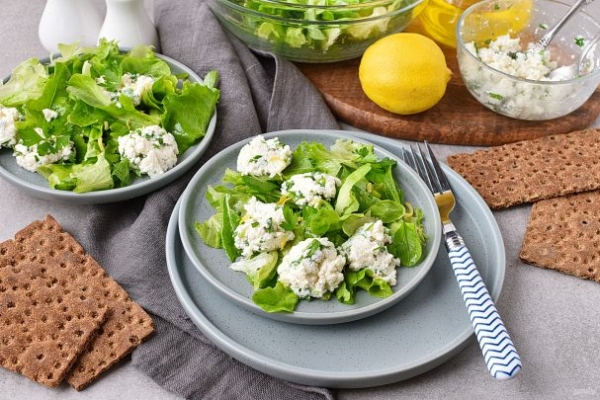 Разложите зелень по тарелкам. С помощью двух чайных ложек сформуйте из творожной смеси небольшие шарики и выложите на листья салата. При желании добавьте немного лимонной цедры.
