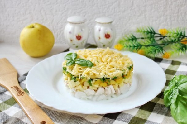 Выложите ингредиенты салата в такой последовательности: репчатый лук с измельченным чесноком, отварная курица, яблоко, ананас, зелень, сыр. Слой курицы посолите. Каждый слой смажьте майонезом.