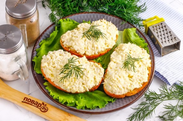 Для подачи выложите приготовленный салат на ломтики хлеба: батона, кирпичика или багета. Украсьте свежей зеленью. Приятного аппетита!