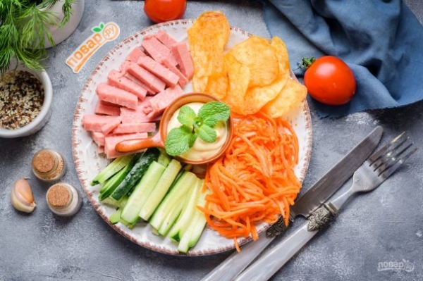 Вам не придется варить отдельно овощи, яйца, запекать мясо. Все очень просто — берем морковь по-корейски, свежий ароматный огурчик, ветчину и чипсы. Салат выкладывается небольшими кучками, в центре ставим емкость с майонезом. Гости уже самостоятельно будут смешивать ингредиенты у себя в тарелке, так как чипсы нам нужны хрустящие и аппетитные. Сочетание очень вкусное, пробуйте!