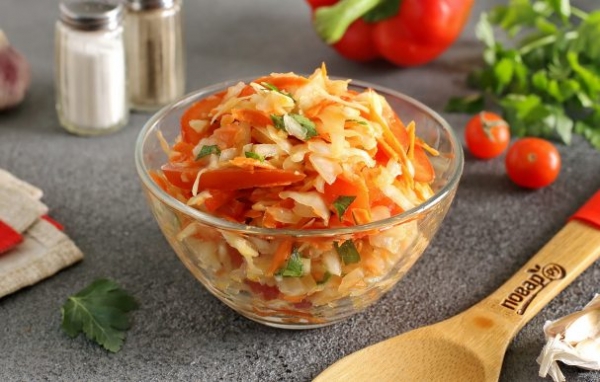Добавьте к капусте нарезанный небольшой соломкой болгарский перец.