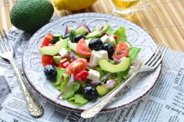 Приготовьте вкусный и полезный овощной салат с авокадо и маслинами. Также добавьте помидоры, огурцы, немного брынзы и листьев салата. Для остроты добавьте в салат красный салатный лук, он очень пикантный. Для заправки используйте оливковое масло и лимонный сок.