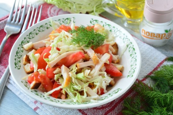 Салат с капустой, ветчиной и сухариками готовится быстро и просто. Предлагаю пожарить сухарики самостоятельно из батона, а ветчину и капусту всегда можно купить в любом магазине. Для сочности добавьте еще и помидоры. Салат выходит оригинальным и пикантным.