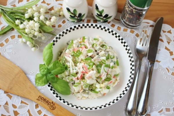 Приготовить такой салат не составит особого труда для любой хозяйки. Один из ингредиентов в нем — крабовое мясо или крабовые палочки, которые в тандеме с отварной курицей хорошо имитируют вкус настоящего крабового мяса. Попробуйте такой салат и убедитесь сами!