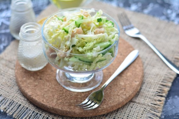 Салат с пекинской капустой идеально подходит для похудения. Свежие овощи улучшают обмен веществ. Готовьте салат несколько раз в неделю и подавайте к столу в обеденное время или на ужин.