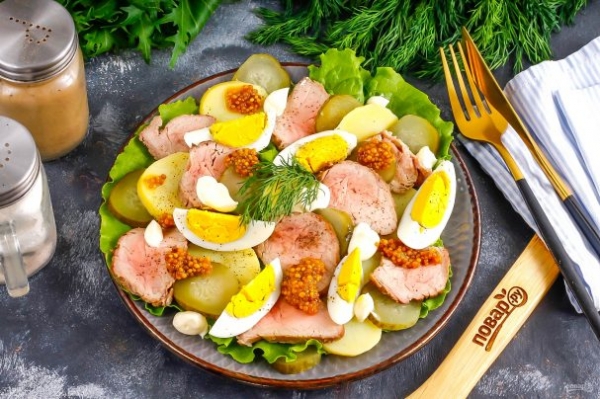 Такое сытное блюдо точно понравится мужчинам, так как они любят мясные салаты с картофелем и горчицей. Вы можете заменить зерновую горчицу на обычную. По желанию картофель и яйца можно отварить заранее или с вечера.