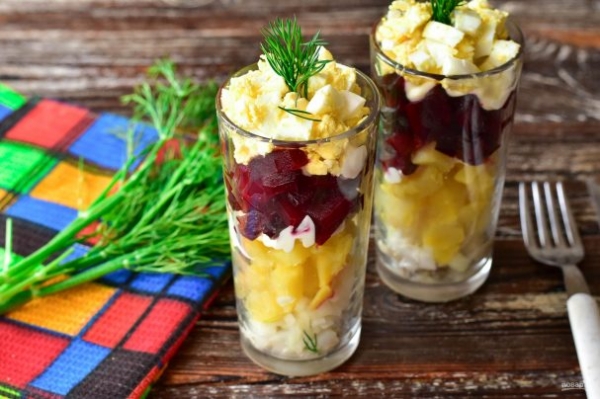 Салат "Селедка под шубой" в стаканчиках готов! Приятного аппетита!