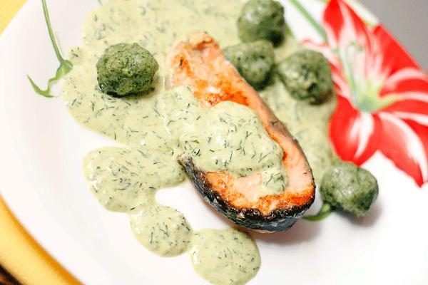 Зеленый сливочный соус получается очень нежным, он придает блюдам очень деликатный и мягкий вкус. Я пробовала подавать этот соус с разными блюдами и могу определенно сказать, что лучше всего зеленый сливочный соус сочетается именно с рыбными блюдами, особенно — с блюдами из красной рыбы.