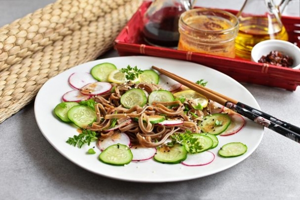 Легкий и пикантный салат с гречневой лапшой понравится приверженцам здорового питания. Ведь гречневая лапша не содержит глютен, а витаминов и железа в ней больше, чем в пшеничной.