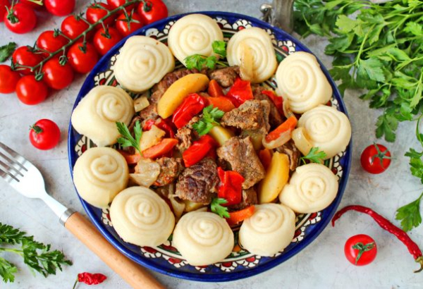 В большое блюдо переложите баранину с овощами, полейте бульоном и выложите хинкал "Розочки".
