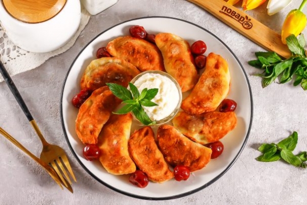 Уникальное лакомое блюдо — румяные жареные вареники с вишней, с удовольствием отведают взрослые и дети. Подавайте их со сметаной или сладким вареньем, кремом, обжаривая в масле всего лишь 5-6 минут.