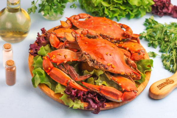Выложите крабов на доску или блюдо и подайте к столу горячими. Дополните вкусными соусами, салатами и бокалом белого вина. Приятного вам аппетита!
