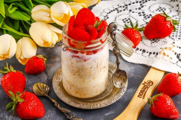 Красочное блюдо можно подавать не только на завтрак, но и в полдник. Ему очень обрадуются дети, ведь они не любят есть соленую овсяную кашу, а сладкую — уплетают за обе щеки! Клубнику можно заменить любыми ягодами или фруктами.