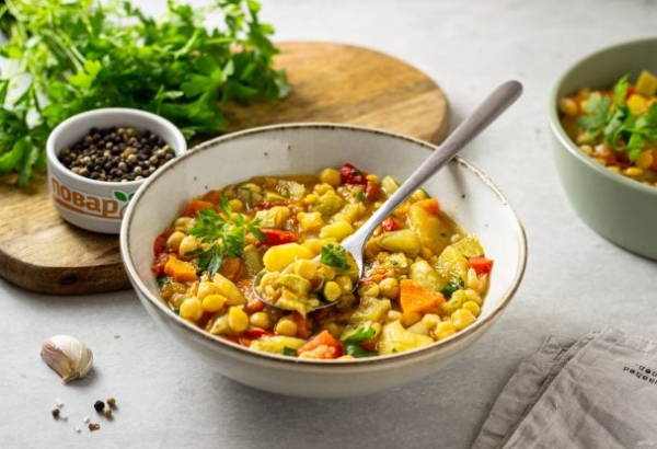 Делюсь рецептом овощного рагу с добавлением турецкого гороха нута. Это сытное, согревающей блюдо, которое можно подать на ужин или обед. Оно подойдет для постного стола.