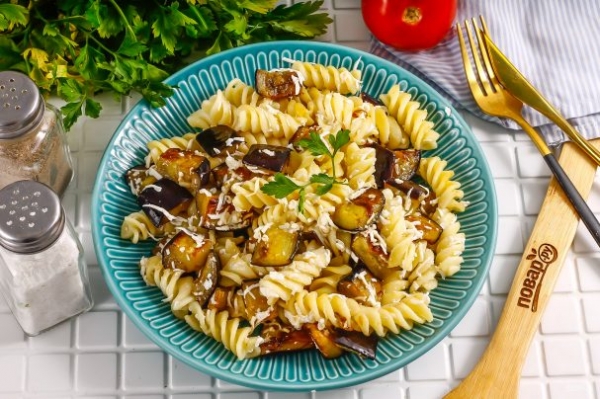 Сочную и вкусную пасту можно приготовить и без добавления мяса, к примеру — с фетой и баклажанами. Такое блюдо будет актуально на обед или ужин при подаче со сметаной, чесночным соусом или майонезом.