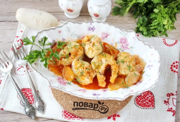 Накройте кастрюлю крышкой и тушите рыбу с редькой на небольшом огне 15-20 минут до готовности.