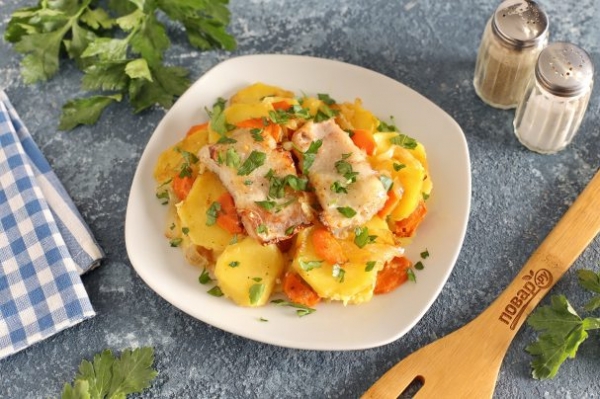 На овощи выложите маринованное филе судака. Запекайте в духовке при температуре 180-200 градусов около 40 минут. Если верх начинает подрумяниваться, а картофель еще не готов, то просто накройте форму фольгой.