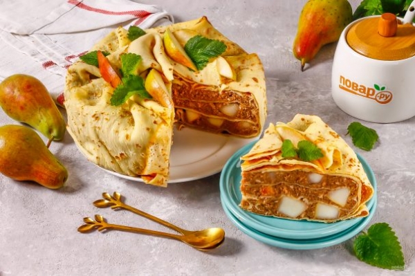 Готовый пропитанный торт извлеките из холодильника и из формы, украсьте сверху оставшимися блинами, свежей мятой и грушевой нарезкой. Подайте к столу.