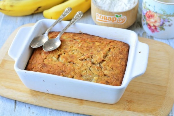 Диетический банановый пирог легко готовится и идеально выпекается в духовке. Для теста используйте нежирный кефир, овсянку, яйца и немного рисовой муки с разрыхлителем. Для аромата и дополнительного вкуса используйте ванильный сахар, орешки и мед.